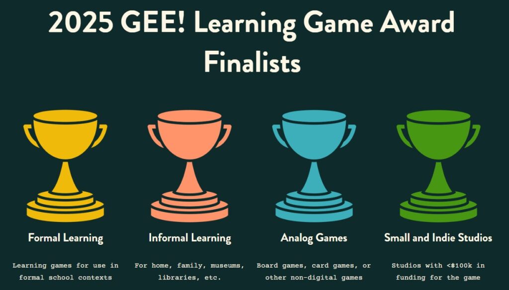 The GEE! award recognizes excellence in educational game design. The award is judged by international leaders in the field. It is an honor to be among these esteemed nominees. Please see the full list and consider casting a vote for the People’s Choice Award by August 21, 2025, 11:59PM CST.